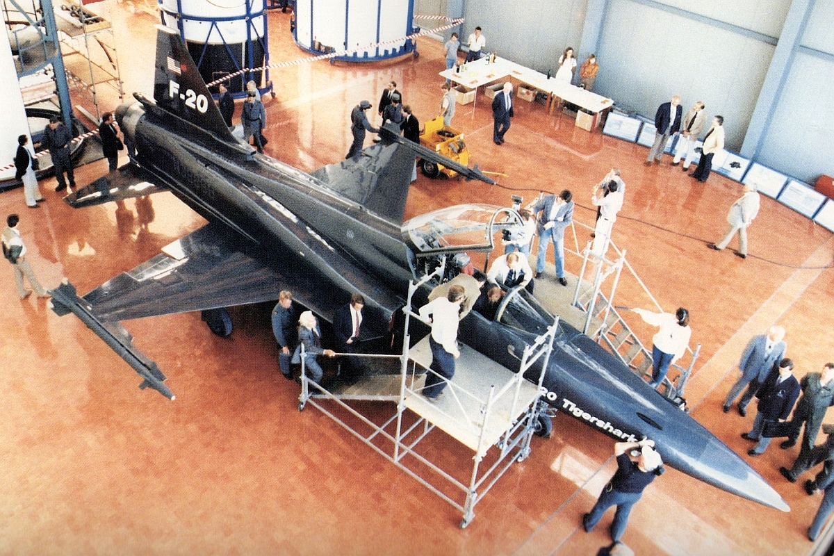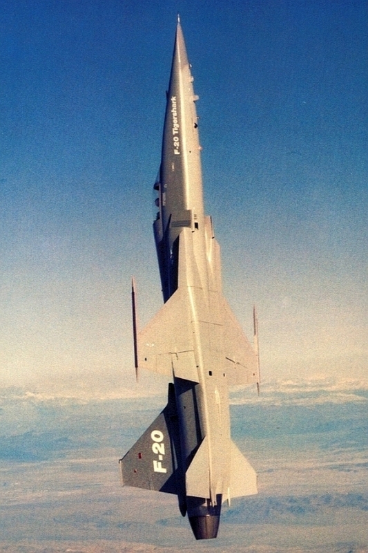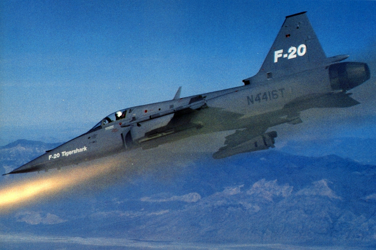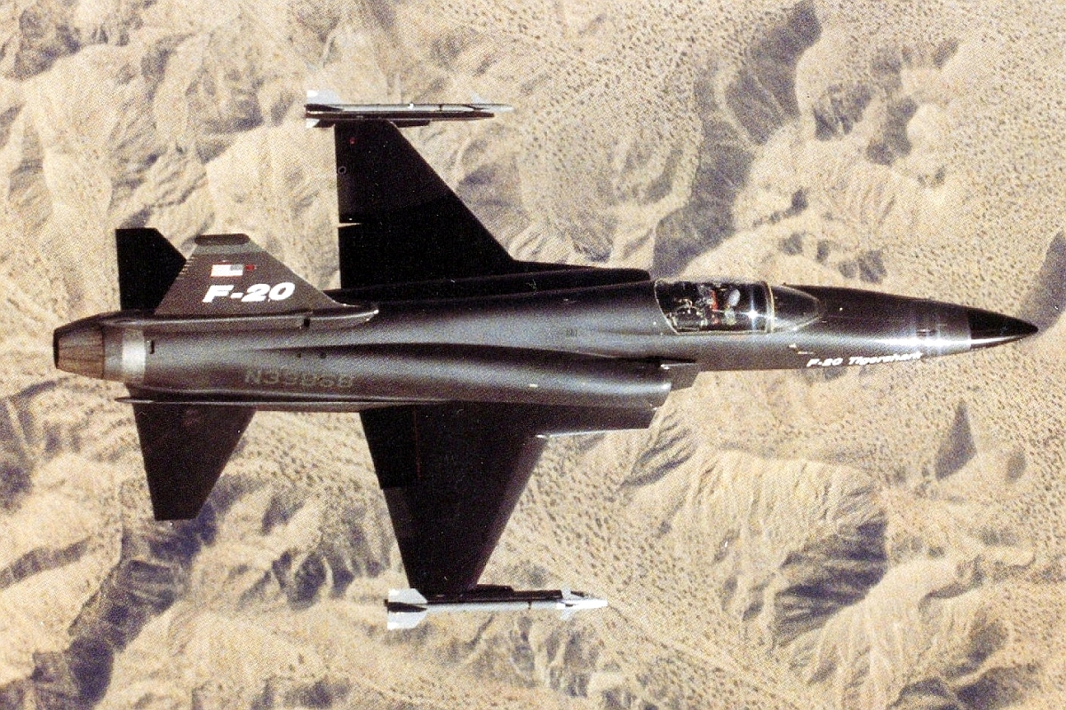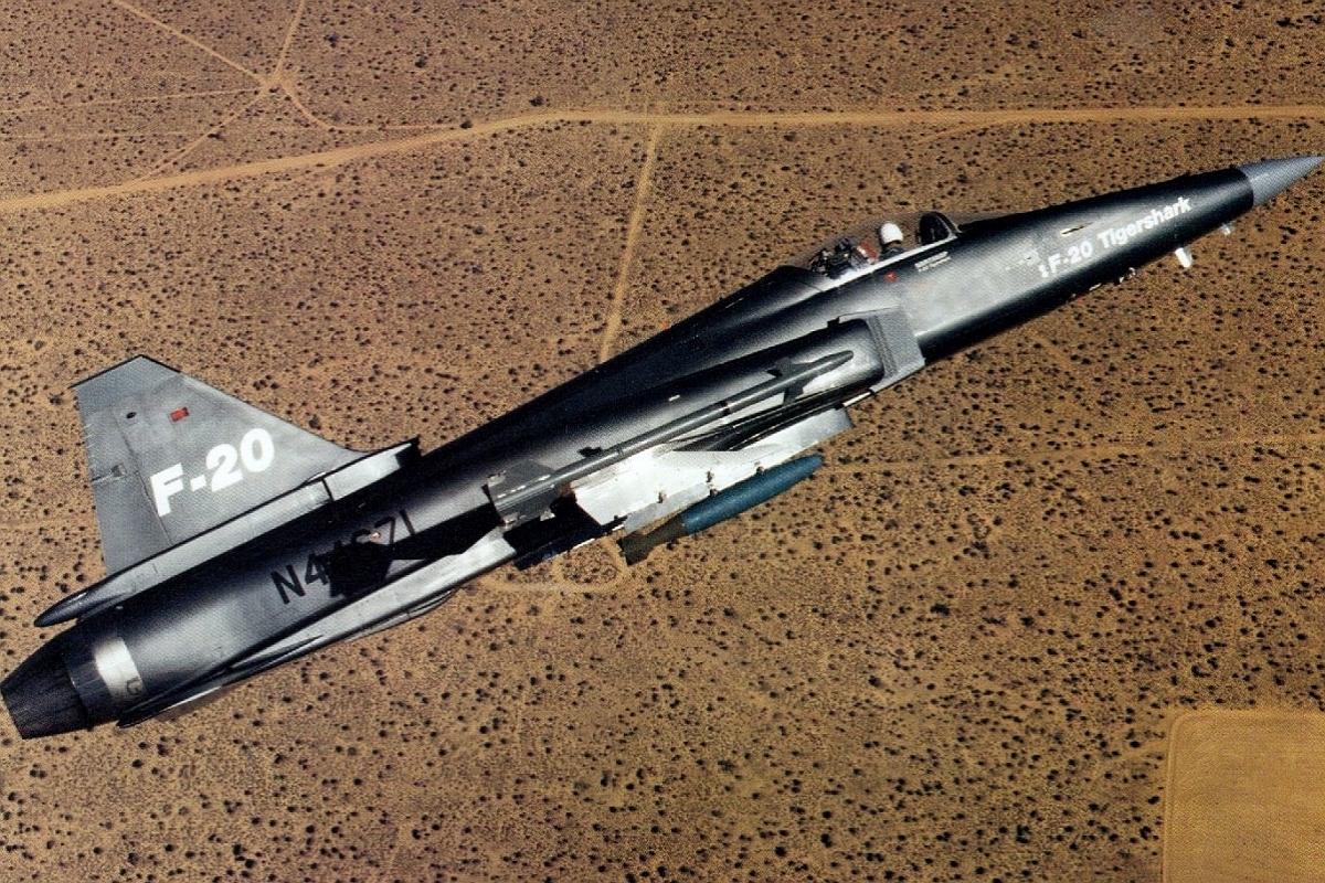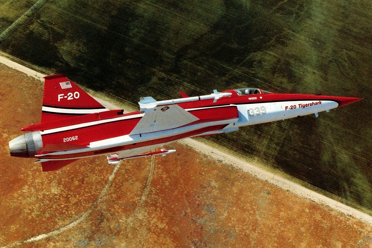 The F-20 Tigershark was an enhancement to the export fighter F-5 E/F and was initially designated as the F-5G. It featured a new single General Electric F-404 engine, modified wing, advanced radar, and fitted with a digital avionics cockpit. At the time is was compatible with other light weight fighters but at a more reasonable cost. This was considered a multi-role aircraft that could conduct air-to-air and air-to-ground missions. Development occurred between 1975 and 1986 when the program was cancelled due to changes in US international politics as it related to the sale of US built military aircraft to foreign allies. Additional information can be found on this Wikipedia page.