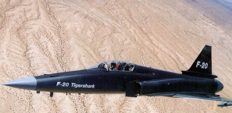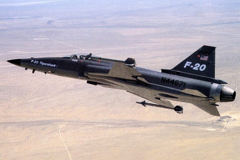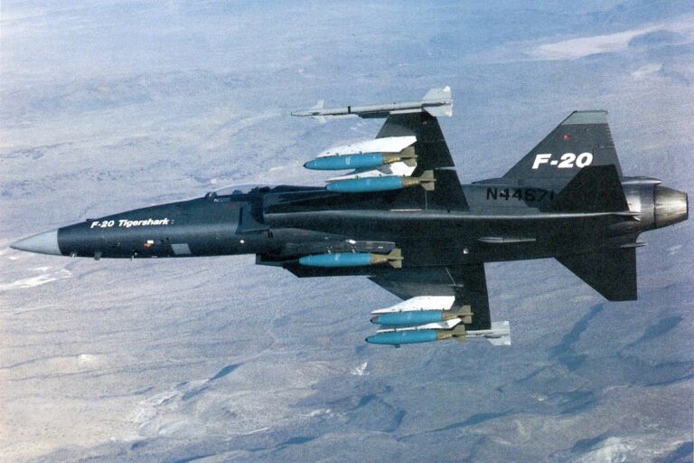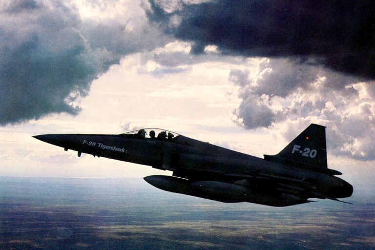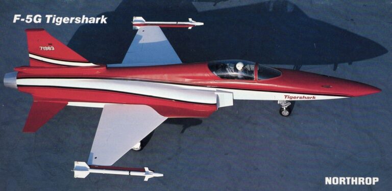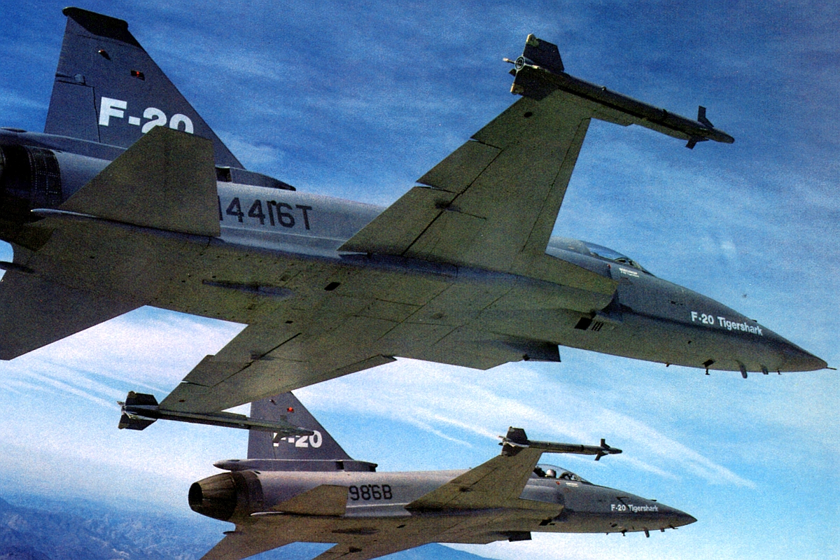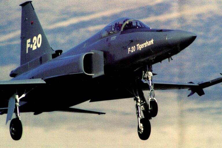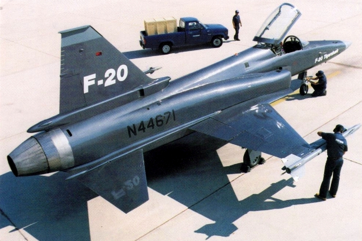 The F-20 Tigershark was an enhancement to the export fighter F-5 E/F and was initially designated as the F-5G. It featured a new single General Electric F-404 engine, modified wing, advanced radar, and fitted with a digital avionics cockpit. At the time is was compatible with other light weight fighters but at a more reasonable cost. This was considered a multi-role aircraft that could conduct air-to-air and air-to-ground missions. Development occurred between 1975 and 1986 when the program was cancelled due to changes in US international politics as it related to the sale of US built military aircraft to foreign allies. Additional information can be found on this Wikipedia page.