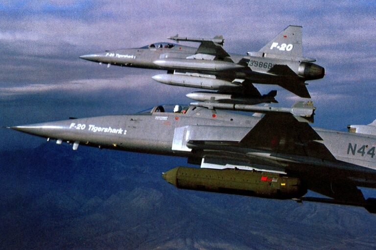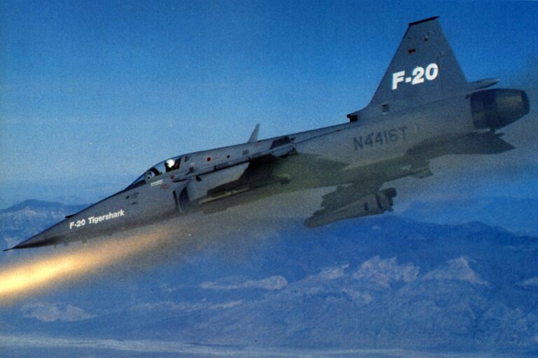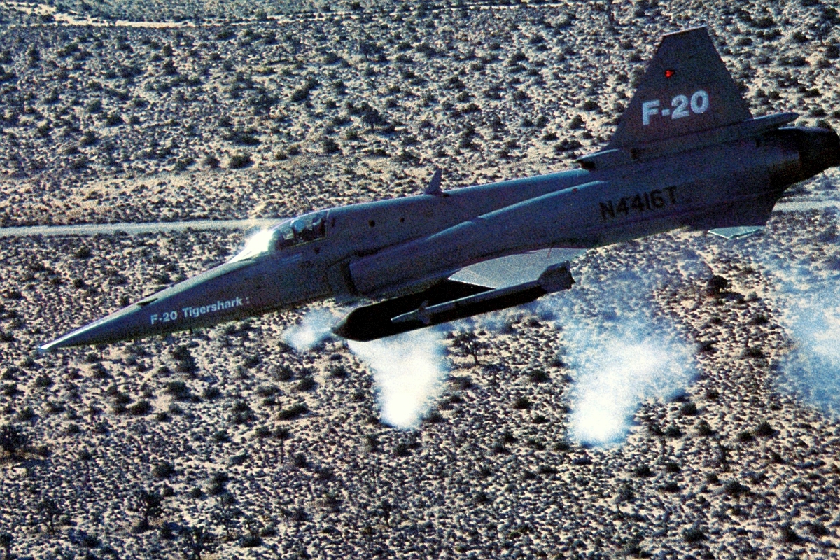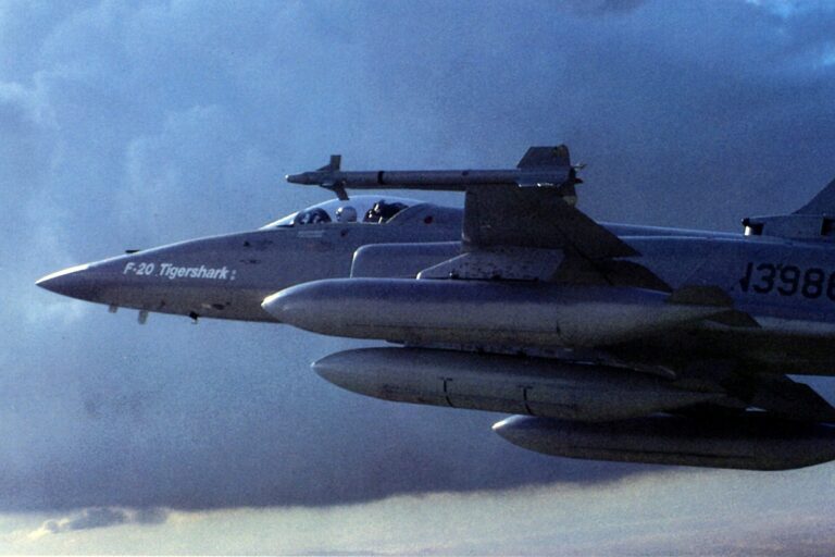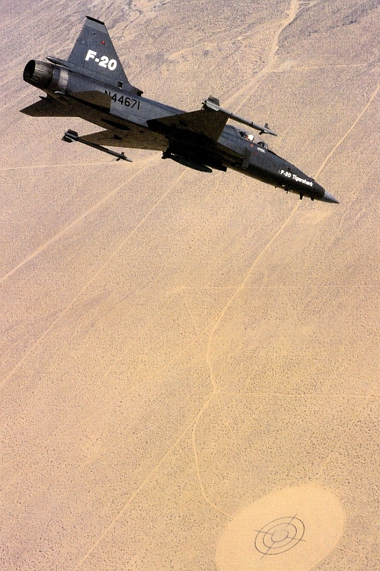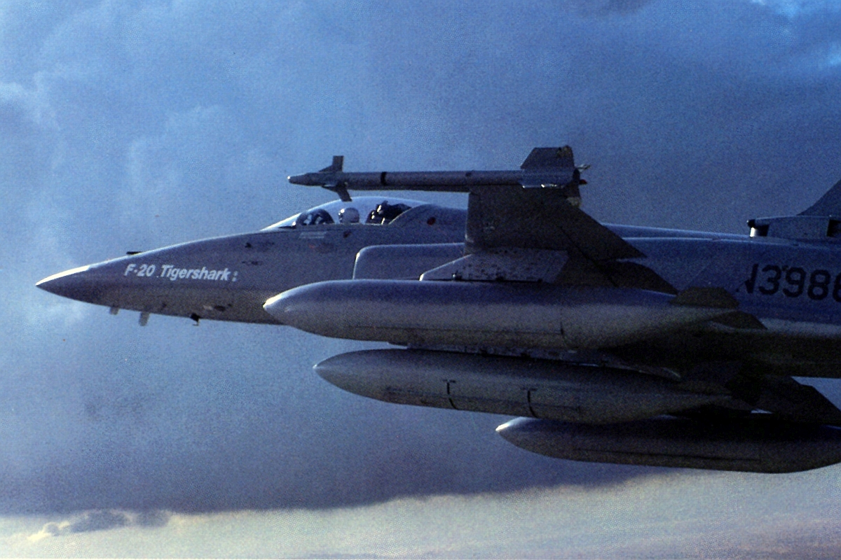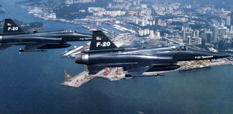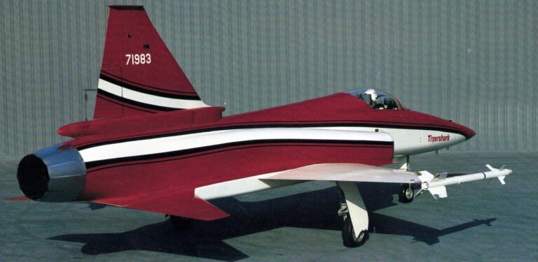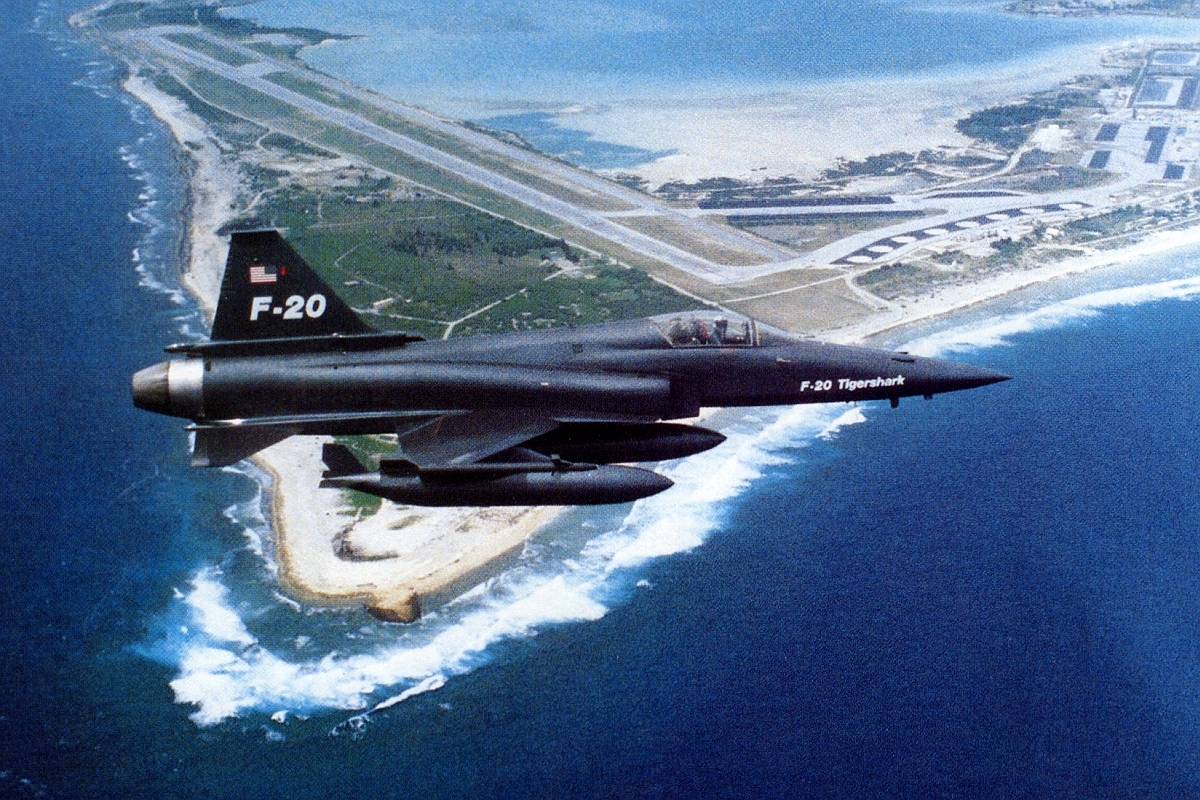 The F-20 Tigershark was an enhancement to the export fighter F-5 E/F and was initially designated as the F-5G. It featured a new single General Electric F-404 engine, modified wing, advanced radar, and fitted with a digital avionics cockpit. At the time is was compatible with other light weight fighters but at a more reasonable cost. This was considered a multi-role aircraft that could conduct air-to-air and air-to-ground missions. Development occurred between 1975 and 1986 when the program was cancelled due to changes in US international politics as it related to the sale of US built military aircraft to foreign allies. Additional information can be found on this Wikipedia page.